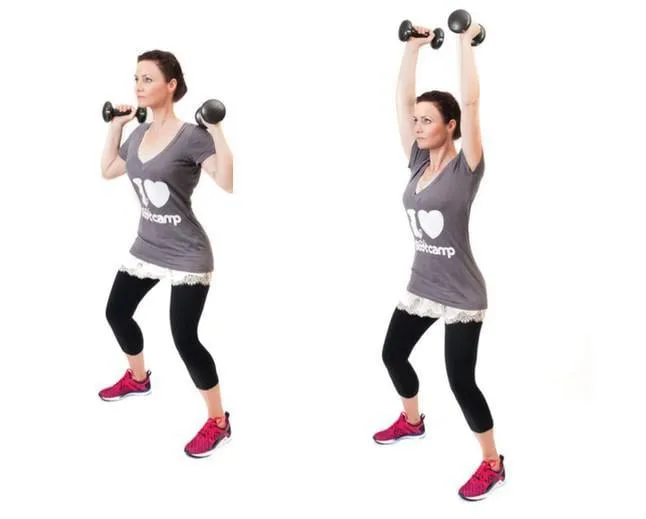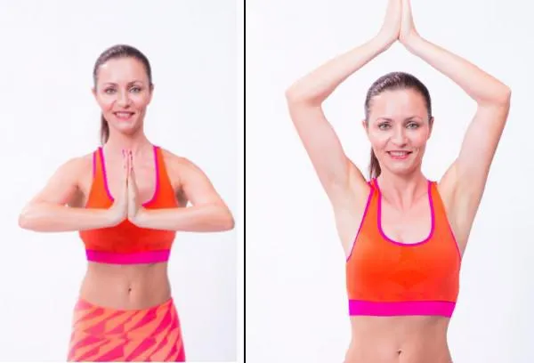 En pratique : prendre un poids dans chaque main ou une bouteille d'eau remplie, tendre les bras en l'air et les ramener de chaque côté de sa tête en fléchissant les coudes. Recommencer l'enchaînement.