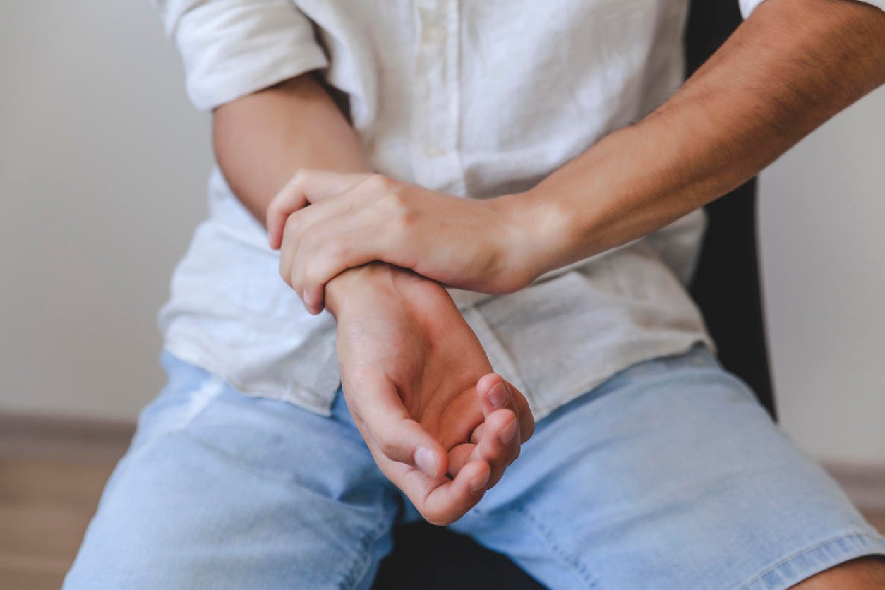 closeup of male arms holding his painful wrist caused by prolonged work on the computer, laptopcarpal tunnel syndrome, arthritis, neurological disease concept numbness of the hand
