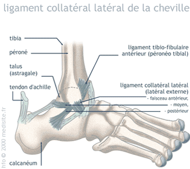 Latéralement se trouvent des structures ligamentaires qui unissent la mortaise au tenon, c’est à dire les os du tibia et péroné au pied. Il s’agit en dehors du ligament latéral externe et en dedans du ligament latéral interne. Leur efficacité est liée à leur tension; s’ils sont détendus, alors la cheville est trop laxe et le patient est victime d’entorses à répétition.