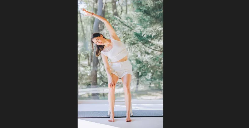 Mouvement : “Sur inspiration par le nez, étirez le bras droit vers le ciel et penchez le buste sur le côté gauche, et sur une expiration par la bouche revenez dans la position de départ, faite la même chose avec le bras gauche.”