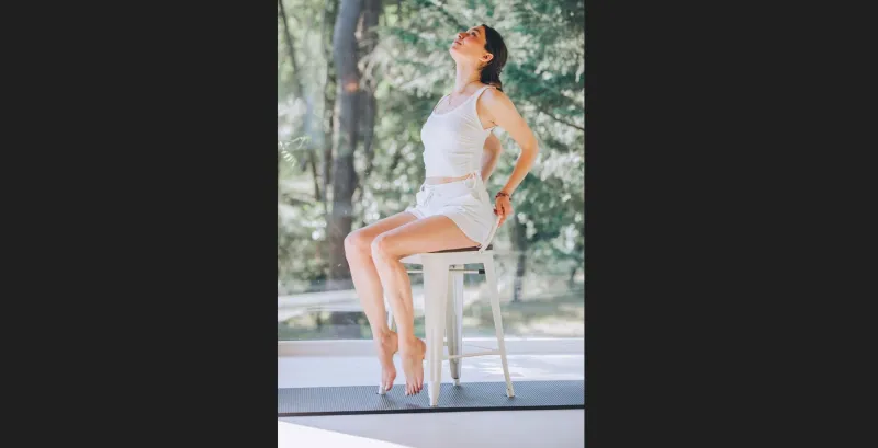 Mouvement : “Inspirez lentement par le nez, et envoyez le visage, le cou et le cœur vers le ciel, comme si l’avant du corps voulait illuminer la pièce. Gardez la longueur dans la colonne vertébrale puis expirez lentement et revenez sur l’axe.”