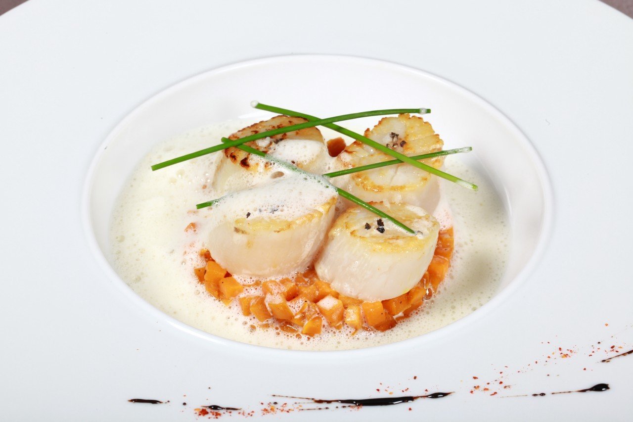 Dans une grande poêle, faites cuire les Saint-Jacques avec une cuillère de beurre pendant 5 minutes. Déglacez les Saint-Jacques avec le jus d'orange. Salez et poivrez.