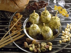 Réaliser de petites boules de chèvre/raisins et les rouler dans la pistache.