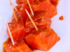 Retirer le saumon de la marinade et planter de petits piques dans chaque cube avant de servir.