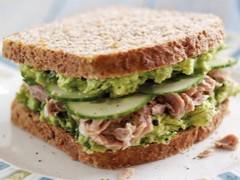 3. Etaler la préparation à base d’avocat sur les deux côtés de chaque tranche de pain, puis ajouter le thon par-dessus et enfin disposer le concombre pour compléter le sandwich.