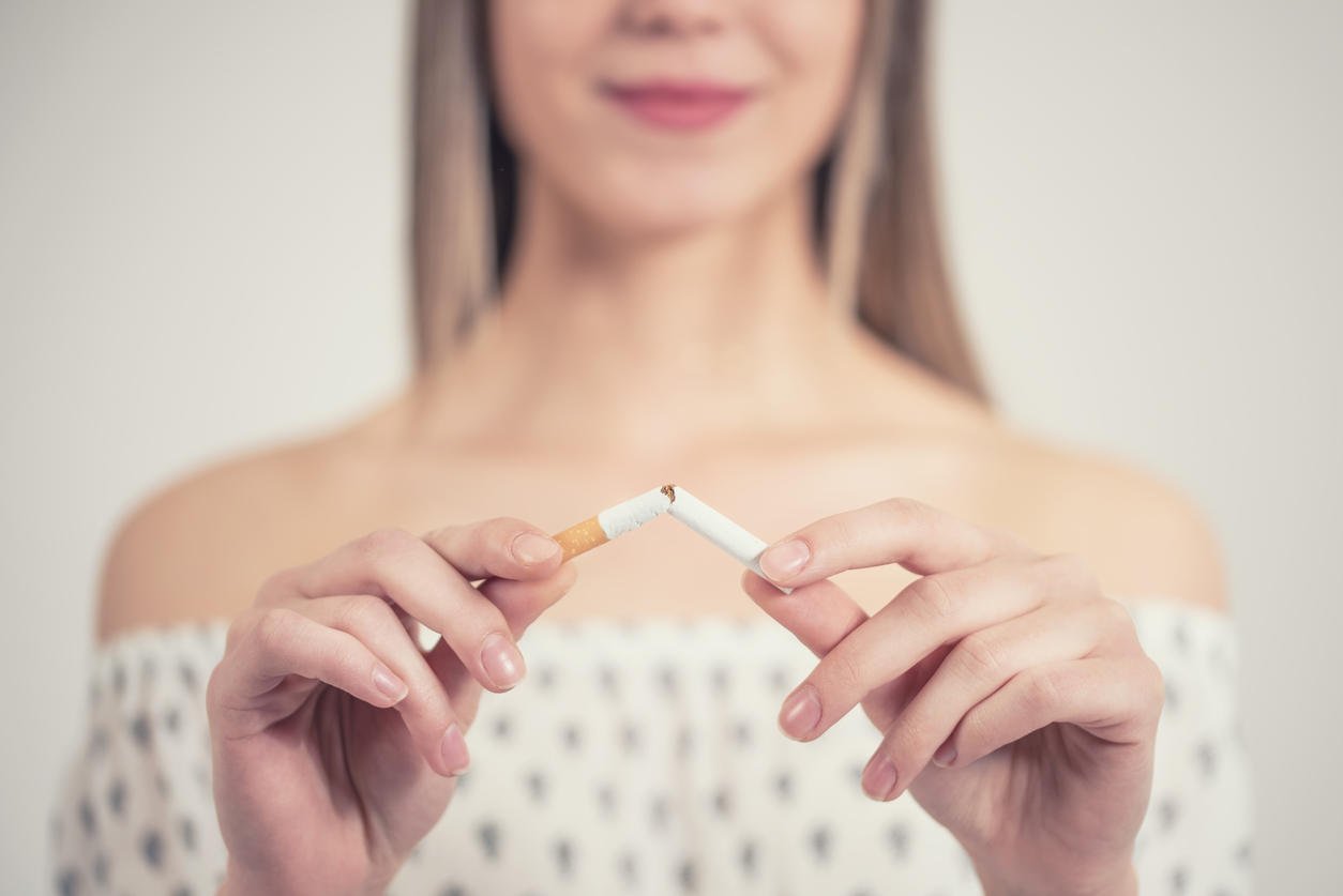 happy young woman breaking a cigarette stop smoking quitting from addiction concept