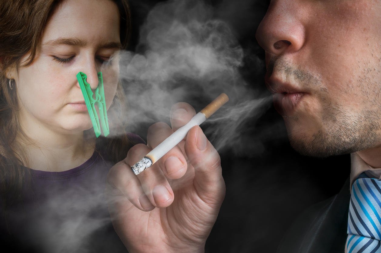 passive smoking concept selfish man is smoking a cigarette woman cant breathe and has peg on her nose