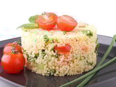 4. Faire gonfler le couscous en versant un verre d'eau bouillante dessus, couvrir.