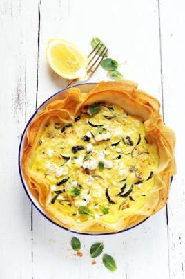Huilez légèrement au pinceau les feuilles de brick, superposez-les et déposez-les au fond d’un plat rond de 24cm de diamètre. Coupez les courgettes en quatre dans la longueur puis en tranches d’environ 1/2cm. Faites chauffer 1 cuillère à soupe d’huile dans une poêle et dorez légèrement les courgettes.