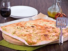 Après 10 minutes, la tartiner de ricotta, déposer le mélange courgettes/oignons et saupoudrer le tout de parmesan.