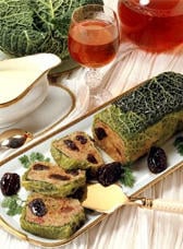 Blanchir les feuilles de chou à l'eau bouillante et salée 3 mn. Les égoutter et les essorer soigneusement. Peler, hacher, puis faire étuver à feu doux ail, oignon et échalote dans la graisse des gésiers. Ajouter ensuite, les feuilles de chou découpées en fines lanières, saler et poivrer. Préchauffer le four th.7. Mélanger dans un saladier la chair de porc et les gésiers de canard hachés ainsi que la préparation de légumes. Ajouter enfin œuf et persil, sel et poivre. Graisser un moule à cake et le tapisser de quelques feuilles de chou. Le remplir de la préparation en y glissant régulièrement quelques pruneaux dénoyautés. Recouvrir avec les feuilles de chou. Mettre le cake dans un bain-marie pour le cuire au four 40 mn. Démouler et servir chaud.