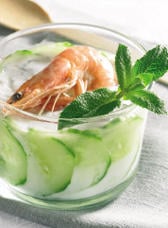 1 beau concombre, 200 g de fromage blanc, 125 g de crevettes roses décortiquées, 8 crevettes bouquet, 1 bouquet de menthe, 1 citron, sel, poivre.