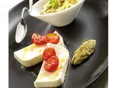 Terrine de Reblochon, tomates caramélisées, tapenade d’olives vertes et noisettes