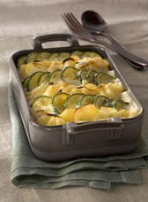 200g de Morbier en lamelles, 2 courgettes, 600g de pommes de terre à chair ferme, 1 oignon, 3 cuillères à soupe d'huile d'olive, sel et poivre.