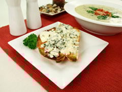 6. Disposer les tranches de pain frottées à l'ail dans un plateau et poser dessus le bacon au bleu.