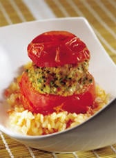 4 grosses tomates bien mûres, 1 verre de lait écrémé, 4 biscottes, 4 tranches de jambon blanc, 2 gousses d'ail, 1 oignon, 1 bouquet de persil, 200 g de chair à saucisse, 2 œufs, 200 g de riz blanc, huile d'olive, sel, poivre.