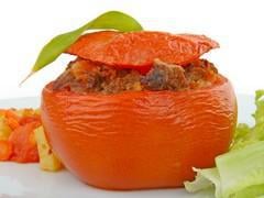 8. Couper le haut des tomates pour obtenir un couvercle, les vider, remplir avec le hachis de viande et placer dans le panier de la friteuse.