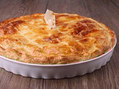 Laisser refroidir puis disposer la pâte feuilletée pour faire une tourte. Badigeonner la pâte de jaune d'oeuf. Faire un trou au milieur de la pâte.