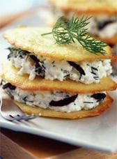 Monter les millefeuilles en alternant une tuile au fromage et une couche de fromage blanc aux olives.