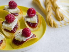 Déposez une noisette de confiture de framboises sur chaque tuile puis recouvrez d’une petite part de brie.