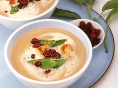 Nos suggestions pour Velouté de châtaignes aux gambas, cranberry et pois gourmands.