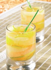 Pendant ce temps, bien égoutter les différents quartiers de fruits et les mettre à macérer, chaque sorte séparément, dans un peu de gelée. Lorsque la gelée est prise dans le fond des verres, disposer une première couche de fruits en intercalant les morceaux de pamplemousse avec quelques quartiers d'orange, de citron jaune et de citron vert. Verser encore un peu de gelée dans les verres et la laisser prendre avant de poser une deuxième couche de fruits.