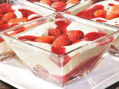 6. Au dessus des fruits, verser la mousse de yaourt dans chaque ramequin. Réserver au frais pendant au moins 45 min.